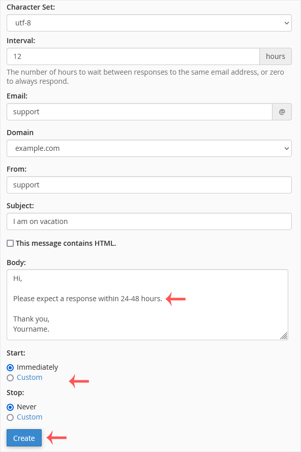 • Email: Enter your email address on which you want to enable autoresponder. To enable auto responder on support@example.com, enter support in the email field.